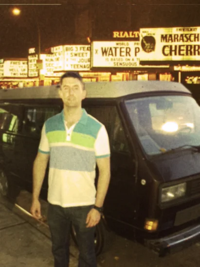 Times Square, 1953.  Founder Todd Buckingham stands before our first RV, a 1952 Volkswagen Bus.